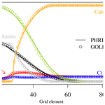 These two benchmarks, while being computationally light – both simulations run in under ten seconds – confirm the reliability of reactive transport outcomes achieved through the new GOLEM-PHREEQC coupling compared to standalone PHREEQC calculations. Both equilibrium and kinetic reaction mechanisms are precisely replicated.