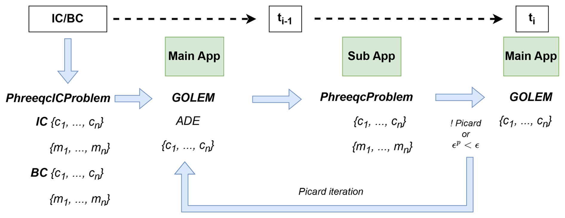 Information exchange between GOLEM and PHREEQC relies on the MOOSE Transfer System framework, offering multiple mesh-to-mesh communication approaches (including nearest node assignment, projections, interpolations and additional methods). Data exchange protocols are typically designed to remain independent of the physical meaning of associated degrees of freedom (dof) between source and destination meshes. Input/output communication between GOLEM and PHREEQC is ensured by correlating each PHREEQC calculation, one per GOLEM elemental dof, with the finite element grid employed by GOLEM. Data reading/writing between solution arrays to/from GOLEM and PHREEQC occur at the elemental scale using the corresponding element identifier, which marks the associated dof of the active calculation. GOLEM and PHREEQC are coupled through fixed point (Picard) iteration methodology utilizing bidirectional data exchange of solute concentrations across timesteps, leveraging MOOSE's MultiApp infrastructure. The user can specify whether the operator-splitting coupling of transport and chemistry is to be solved iteratively (SIA, Sequential Iterative Approach) or non-iteratively (SNIA).