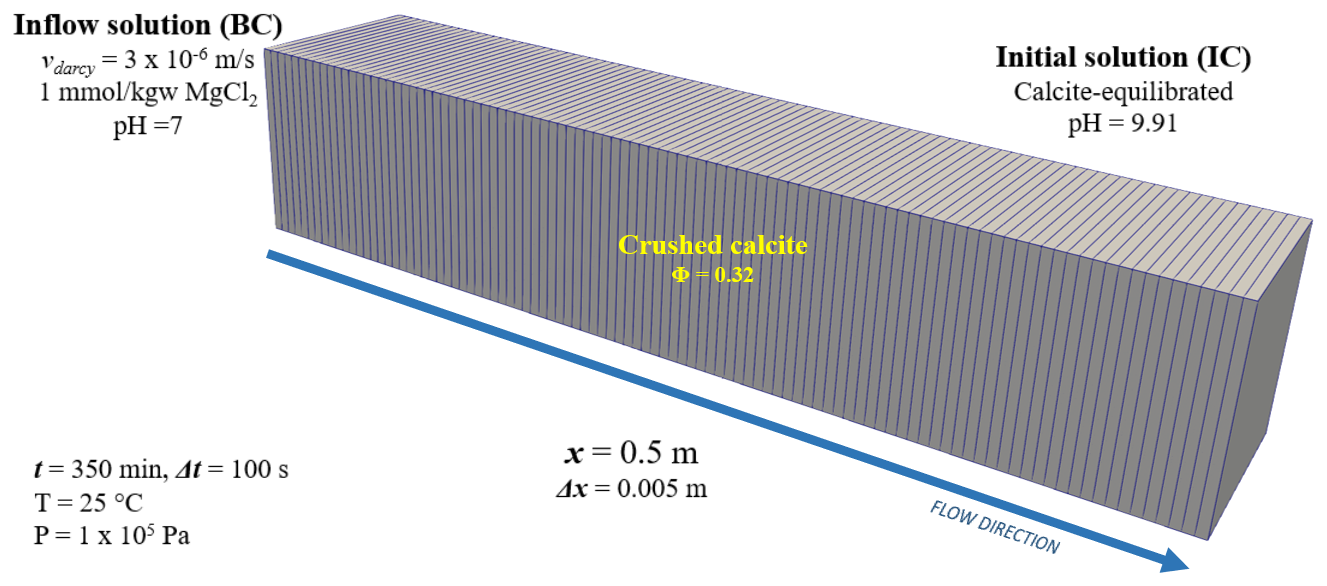 Figure 2Mesh and model setup used for validation of the GOLEM-PHREEQC coupling against PHREEQC's own 1D reactive transport capability.