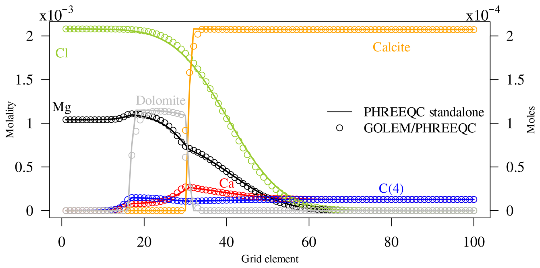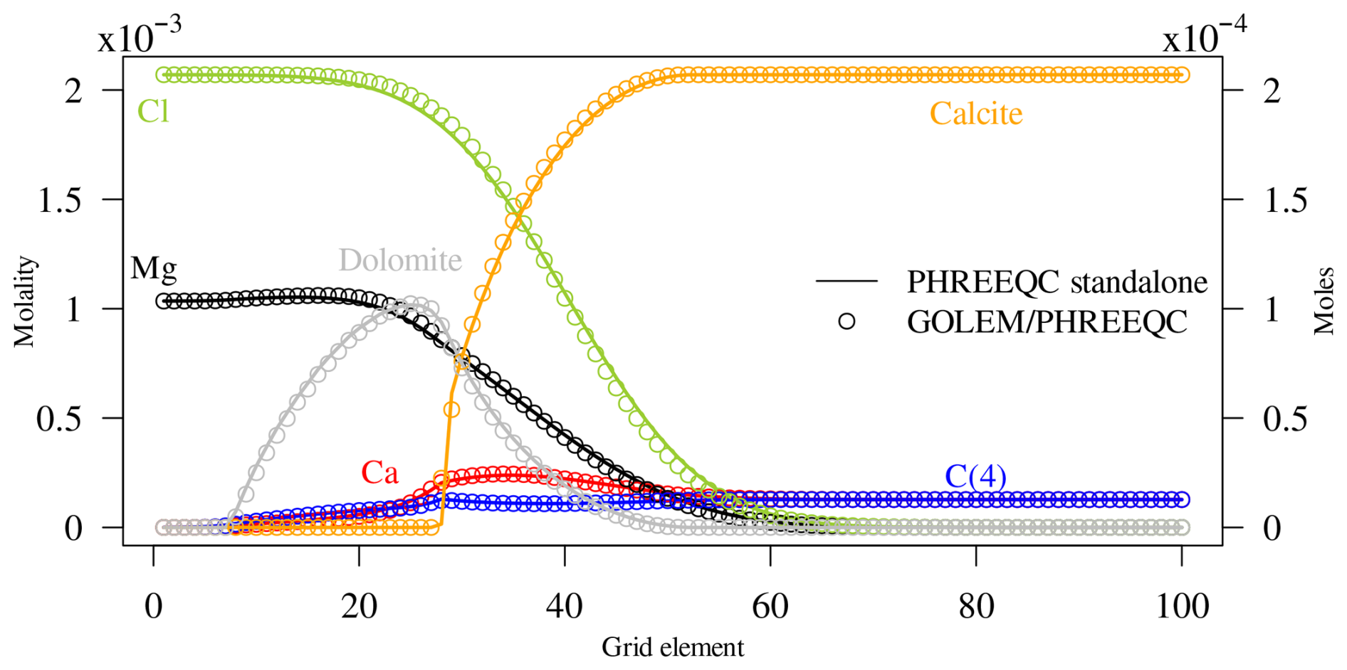 Figure 3Validation of the GOLEM-PHREEQC coupling against standalone PHREEQC, equilibrium simulations.