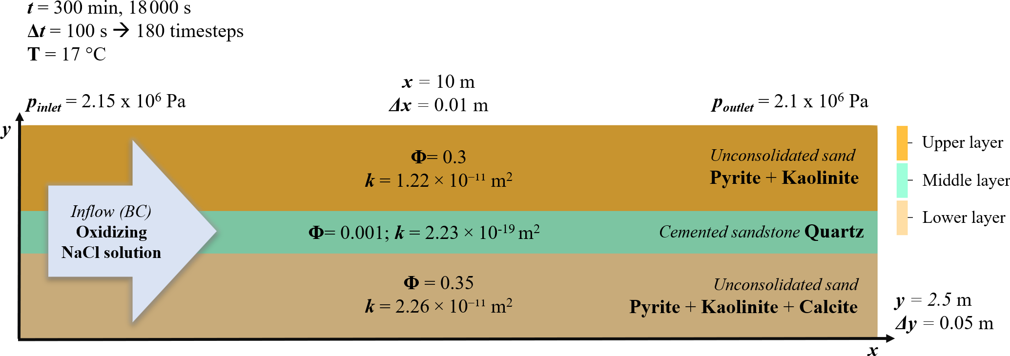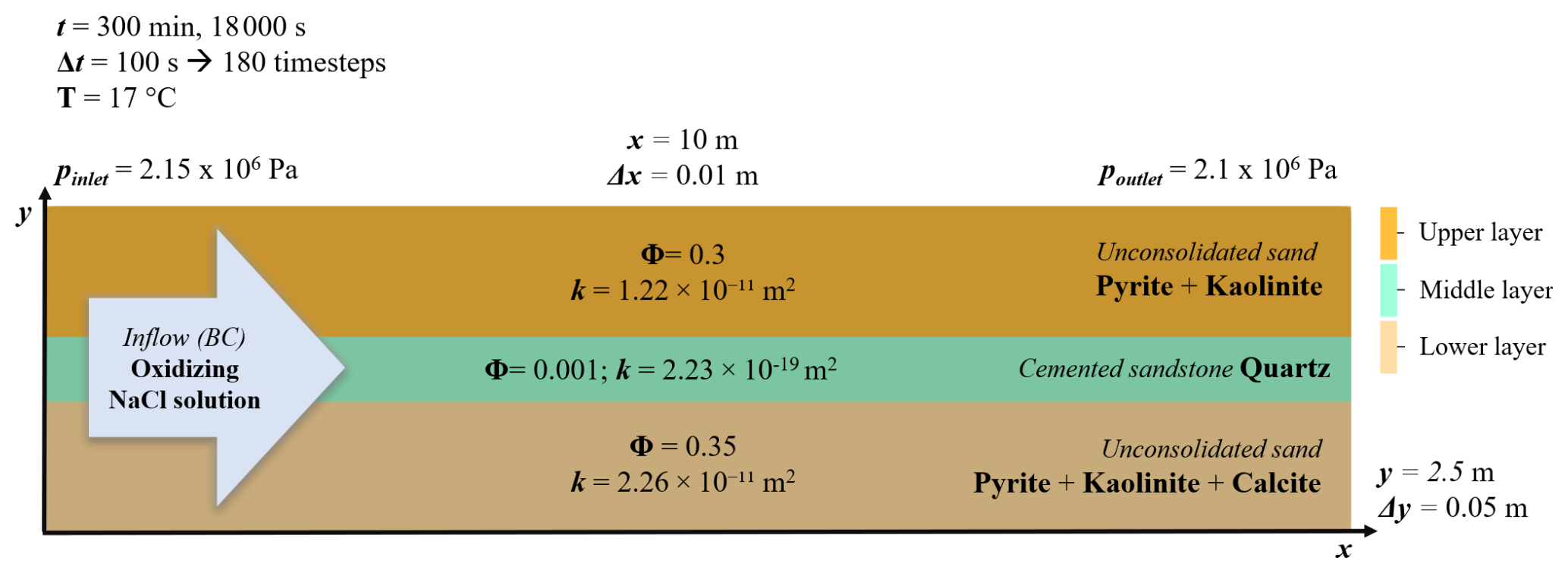 Geochemically and hydrodynamically, the three layers are initialized as distinct and independent domains, each with unique transport properties and specific solute and mineral assemblages (Table 2). The central aquitard is relatively inert due to the slow dissolution kinetics of quartz, while the sandy layers contain more reactive minerals, implemented either as kinetic or equilibrium phases. Pyrite (FeS2) and kaolinite (Al2Si2O5(OH)4) are the primary reactive phases of interest.