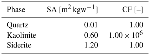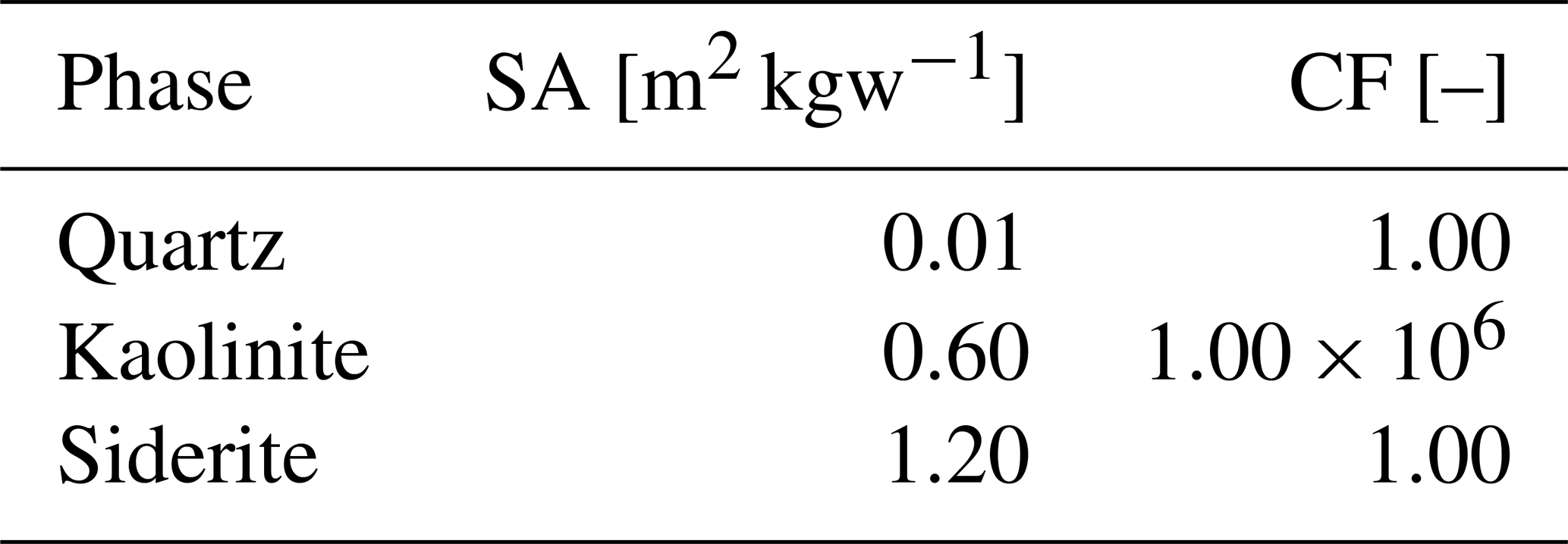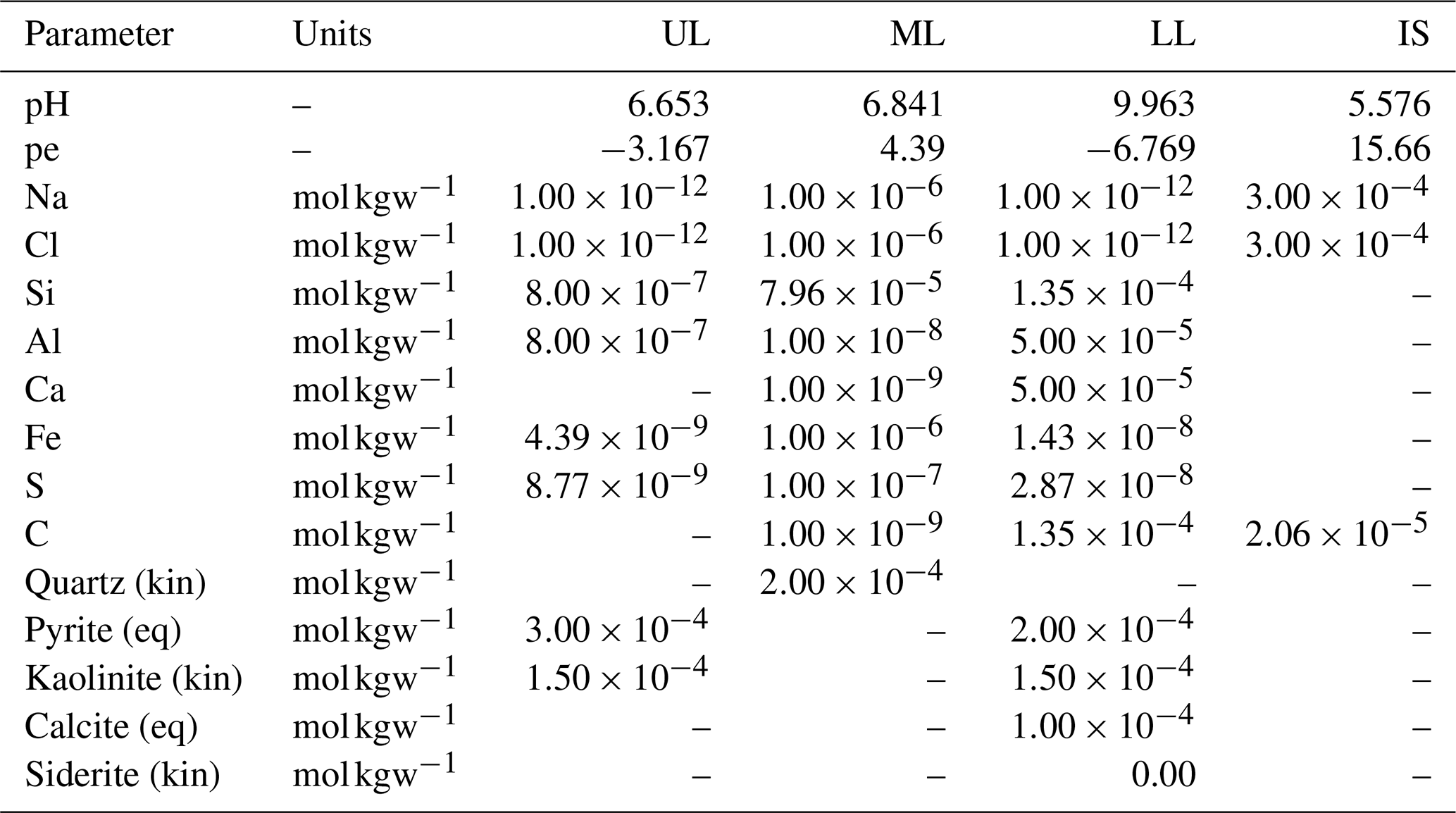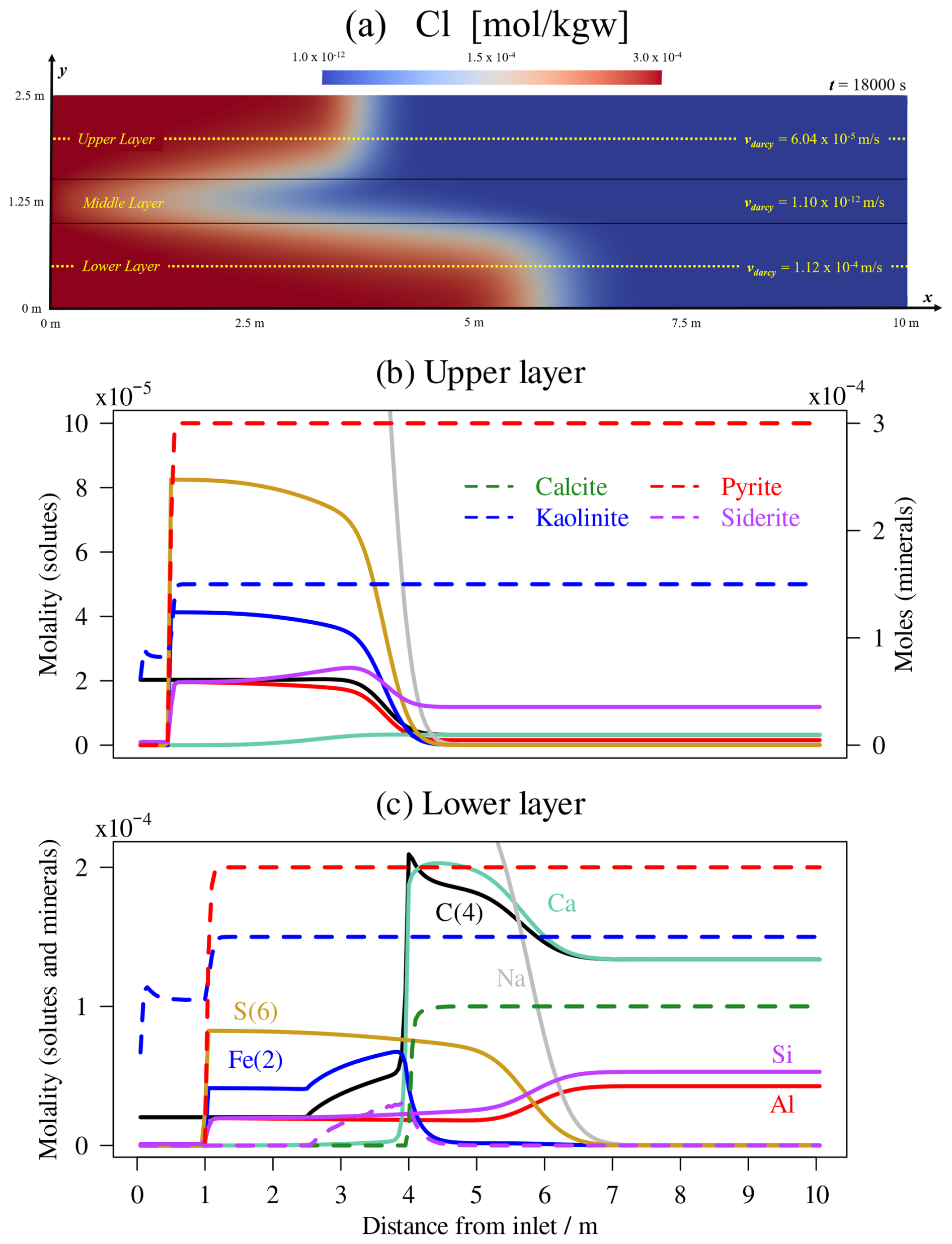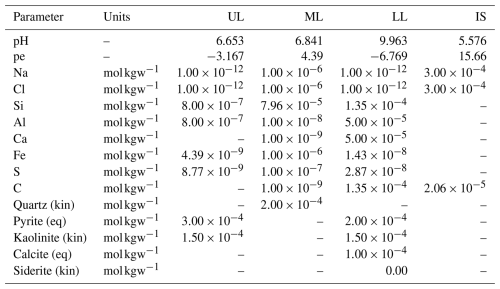 In terms of fluid composition, each layer is initially saturated with a specific set of minerals making use of the phreeqc.dat thermodynamic database. The middle layer is equilibrated with quartz, reflecting its relatively inert character. The upper layer is initially equilibrated with pyrite and kaolinite, whereas the lower layer includes calcite in addition to these phases. This results in elevated concentrations of dissolved and a pH of 9.96 in the bottom layer, compared to the more neutral conditions observed in the upper and middle layers. The injected 0.3 millimolal (mmol kgw−1) NaCl solution entering from the left boundary is initially equilibrated with an oxygen partial pressure of O2(g) of 10−1.00 atm and a partial pressure of CO2(g) of 10−3.38 atm, resulting in a highly positive pe of 15.66 and a moderately acidic pH of 5.58. Pyrite and calcite are modeled as equilibrium phases, while the remaining minerals are under kinetic control. Rate laws were sourced from Marty et al. (2015); the corresponding parameters – initial surface area SA [m2 kg−1] and correction factor CF – are summarized in Table 3. Secondary precipitation of siderite is allowed only in the bottom layer, while precipitation of kaolinite and calcite is suppressed throughout the domain. The injection of oxidizing fluids from the inlet boundary results in a non-uniform transport front due to the hydraulic contrast among the layers. Darcy velocity q ranges from m s−1 in the bottom layer to as low as m s−1 in the middle one, with Cl, which acts conservatively in this simulation, travelling between 4.5 and 7 m within the domain during the simulation period (Fig. 6).