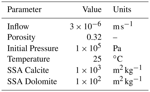 Table 1Parameters of the 1D benchmark used to validate the GOLEM-PHREEQC coupling against PHREEQC in both equilibrium and kinetic models.