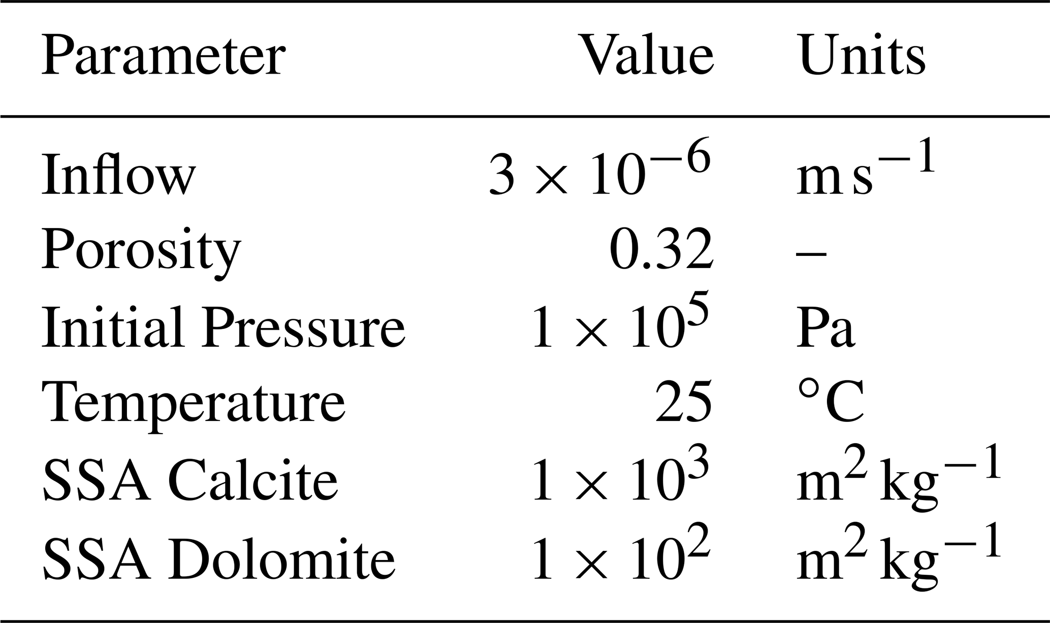 Thermodynamic parameters for hydrolysis, aqueous speciation, and dissolution/precipitation processes involving Mg, Ca, Cl, and carbonate species were obtained from version 12/07 of the PSI/NAGRA chemical thermodynamic database (Thoenen et al., 2014). Both initial and inlet solutions are equilibrated with atmospheric oxygen partial pressure of O2(g) of 10−0.68 atm or 0.221×105 Pa to maintain pe at positive values. Porosity changes throughout the simulation are neglected.