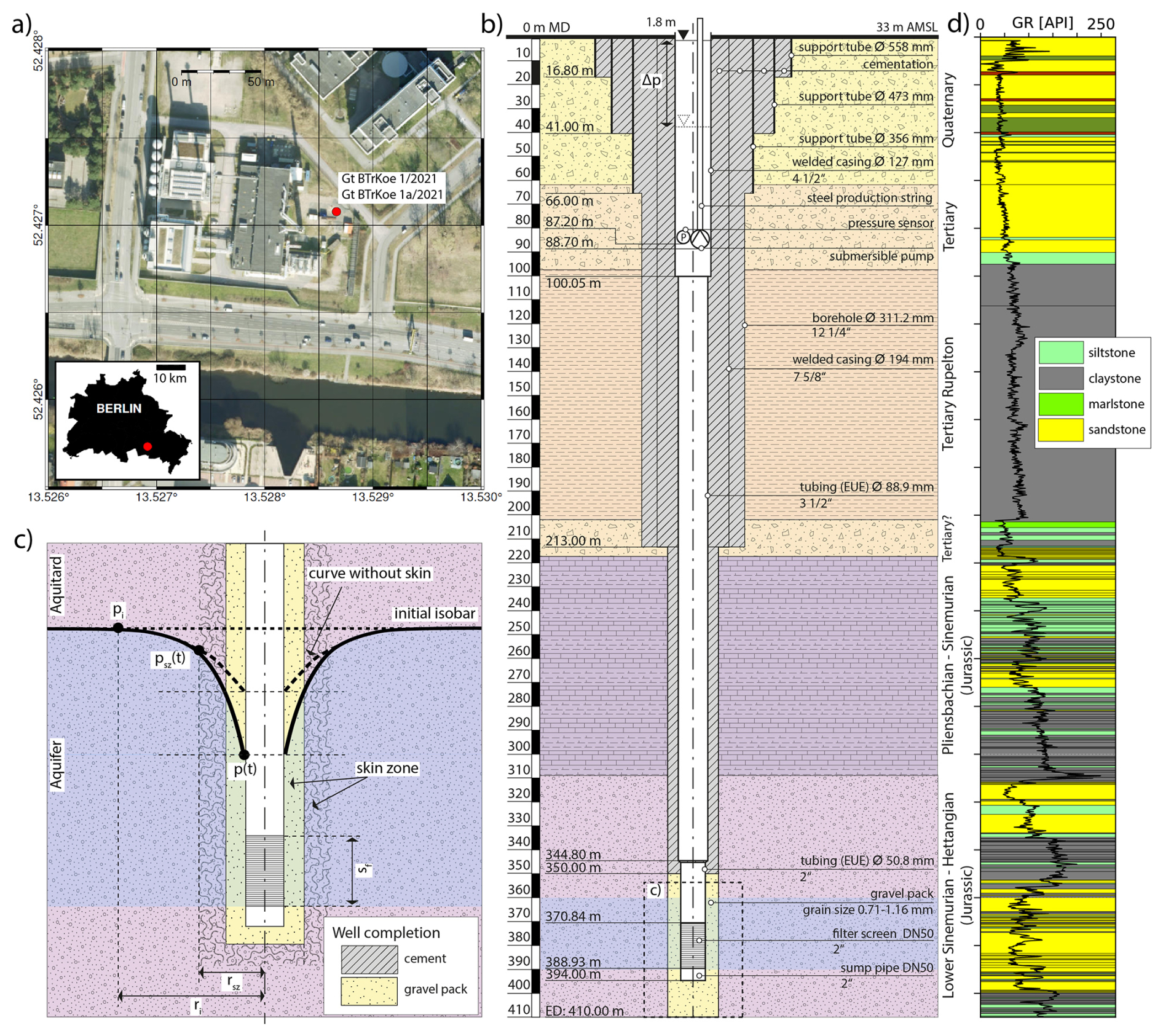 In Adlershof, southeast Berlin (Fig. 1a), the research well Gt BTrKoe 1/2021 was drilled to 456 m Measured Depth (MD) in 2021. Due to a cementing failure, a side track, the Gt BTrKoe 1a/2021, was completed from 213 m MD to a depth of 410 m MD in 2024. Along the entire length of the borehole, four principal sedimentary units were encountered (Fig. 1b): (1) Quaternary sediments down to 62 m MD, (2) Tertiary sediments extending to 202 m MD, with Rupelian Clay reaching from 98 to 202 m MD. The Rupelian Clay above acts as a regional aquitard, effectively isolating the shallow freshwater aquifers from the deeper, more saline groundwater. (3) Pliensbachian-Sinemurian sediments down to 310 m MD (Norden et al., 2023). (4) The Hettangian Formation was selected as the reservoir for an HT-ATES system due to its thickness and promising initial permeability and porosity estimates obtained from drill core and well logs characterization and well log interpretation (Norden et al., 2023). The aquifer has a thickness of 30 m, with a filter screen installed between 370.84 and 388.93 m MD (369 to 387 m TVD) with a length of ca. 18 m. A gravel pack extends significantly deeper, from 350 to 410 m MD, with a radius of 85 mm. The remaining section above the gravel pack was cemented.