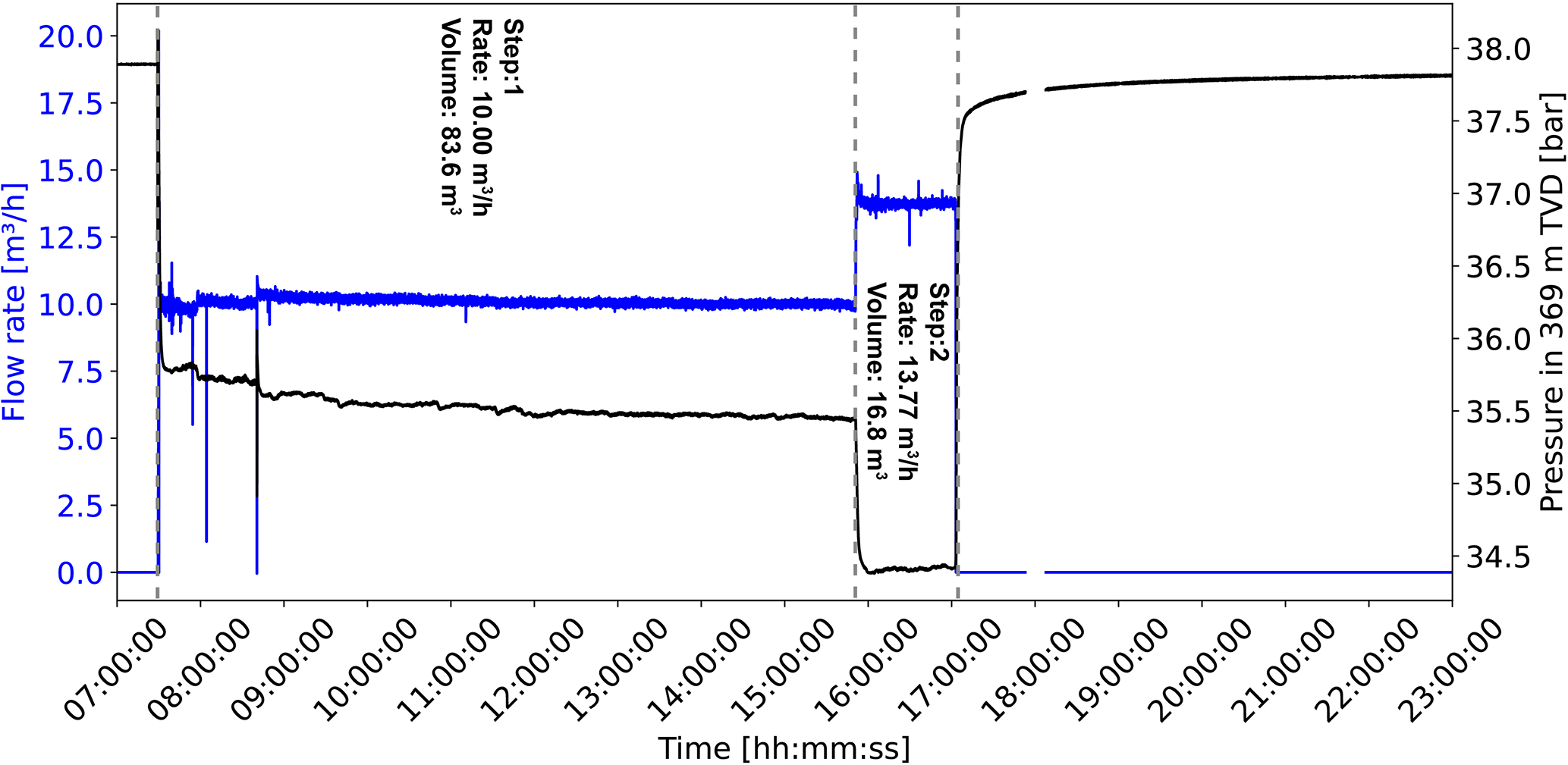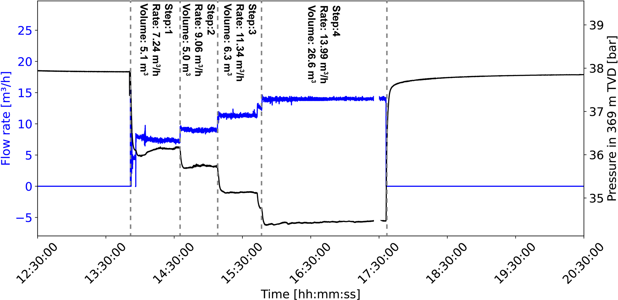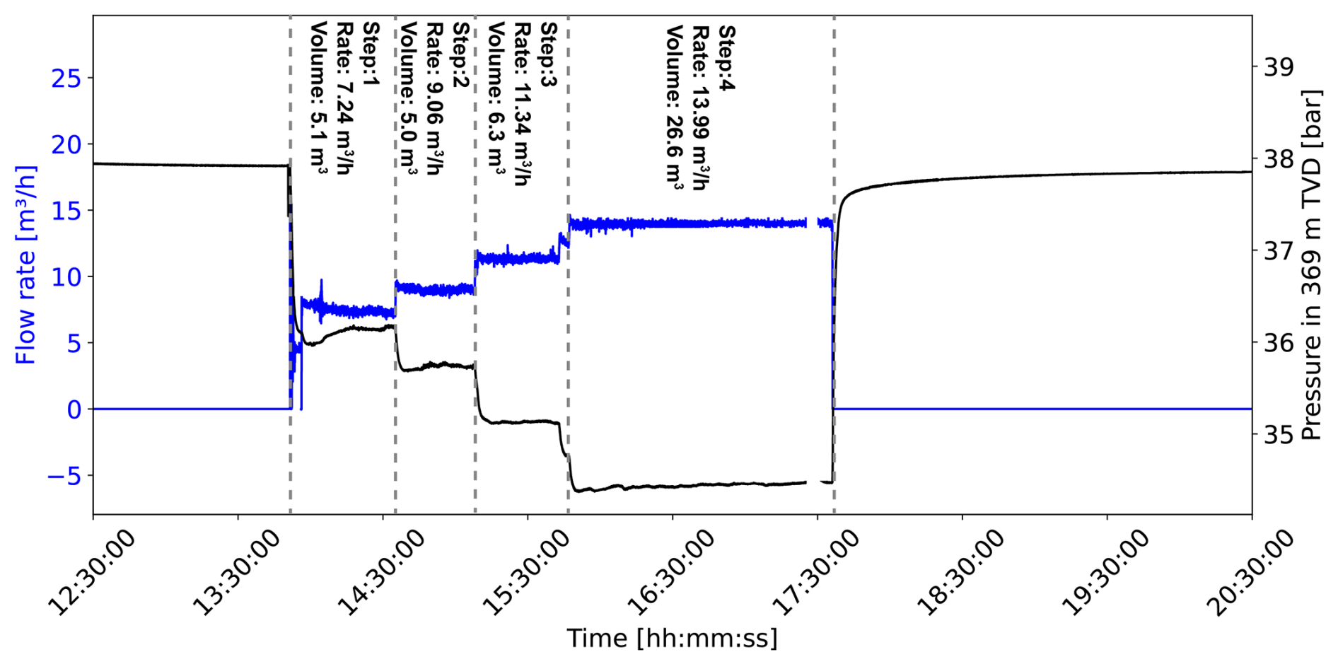 Figure 2Step-rate test on 3 September with flow rate (blue) and pressure (black) at the top of the reservoir in 369 m TVD.