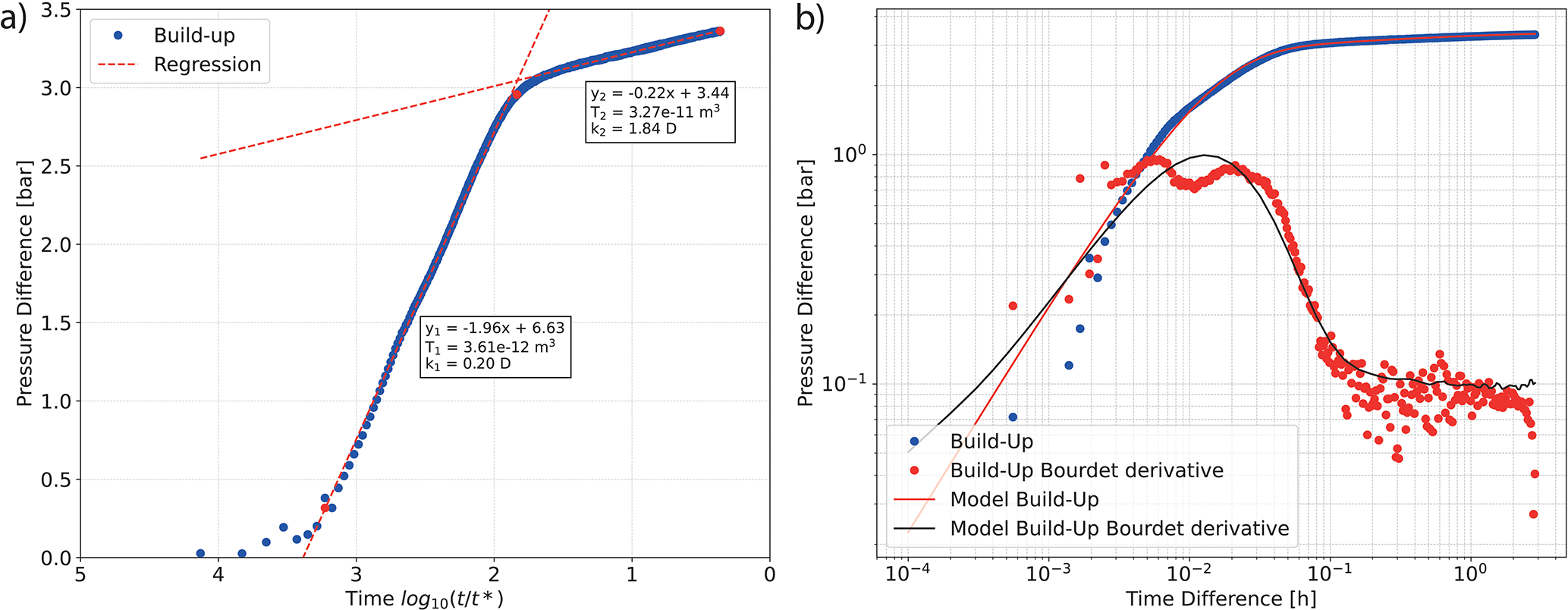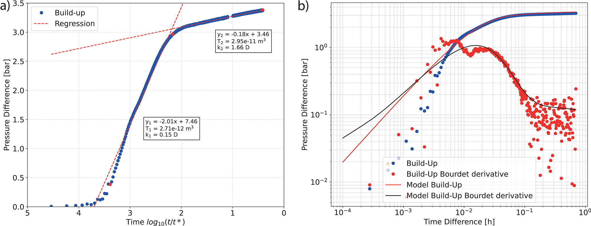 Figure 4(a) Semi-log analysis of pressure difference during the build-up of 3 September. Red lines show the linear regressions of the early (y1) and late (y2) time intervals and in the boxes, the derived values for transmissibility (T) and permeability (k). (b) Double-log plot of the pressure decline curve, including the derivative function, used for pressure matching corresponds to 3 September. Blue dots represent the pressure difference during build-up, while red dots indicate the derivative of the pressure over time. The red and black lines represent the analytical models generated using PTA.