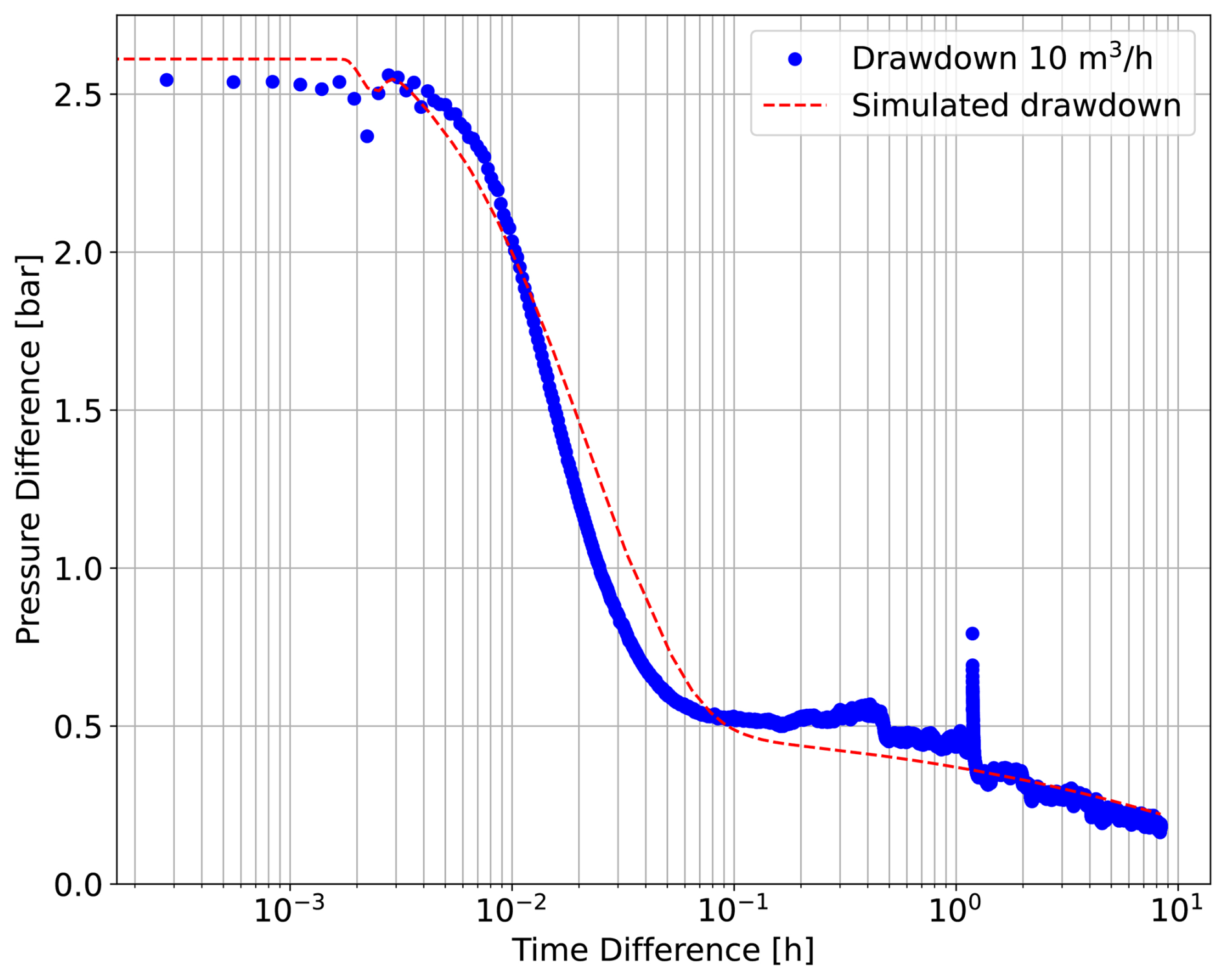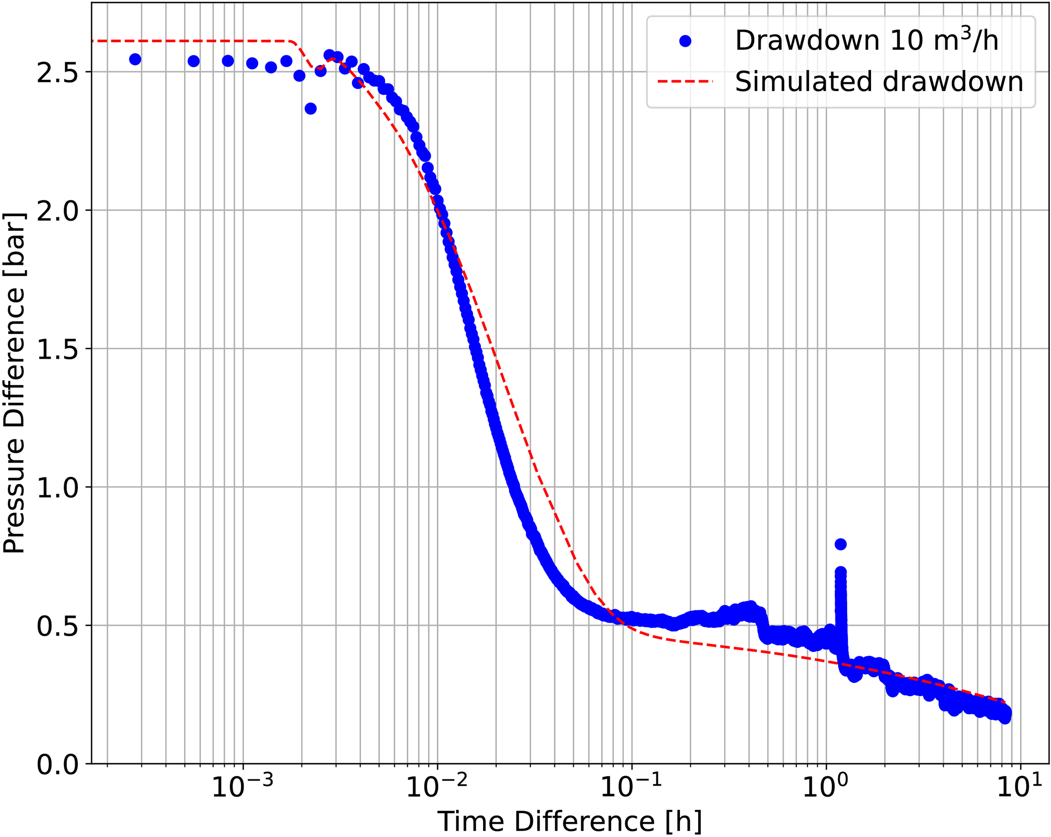The dual-permeability of the planned aquifer thermal storage (Figs. 4a and 5a) as well as the calculated Bourdet derivative (Figs. 4b and 5b) implied the existence of a skin zone. Such skin zone was less permeable than the aquifer material. The skin zone and the aquifer material, together, could be regarded as a composite aquifer (Fig. 1c). With an effort to validate the estimated radial extension of the skin zone, we simulated the drawdown during the first production test stage on 4 September, at a defined production rate of 10 m3 h−1. The simulated drawdown aligned well with the measurements when the modeled radial extension of the skin zone was set to 0.32 m (Fig. 6), with a permeability of 0.15 D for the skin zone and 1.66 D for the aquifer (Fig. 5).